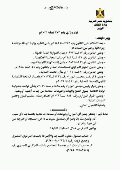 - مادة أولى : يحظر جمع أي أموال أو تبرعات أو مساعدات نقدية بالمساجد لأي سبب كان ويُمنع منعًا باتًا وضع أي صناديق للتبرعات داخل المسجد أو خارجه من أي جهة أو أفراد،ويكون التبرع من خلال الحسابات التالية :حساب صندوق عمارة المساجد والأضرحة بالبنك المركزي المصري وجميع فروعه رقم ( 9/80274/450/9)، حساب تبرعات البر وخدمة المجتمع بالبنك المركزي المصري رقم (9/78899/450/9).